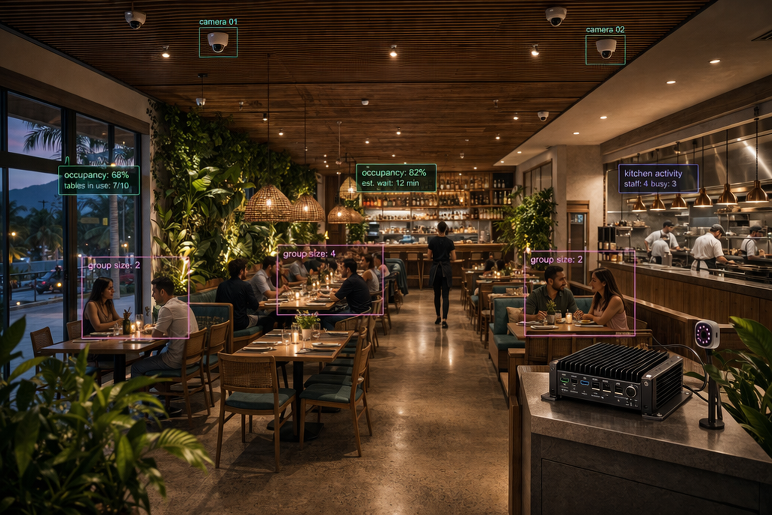 Measure occupancy patterns and customer flow with local analytics that support staffing and layout decisions.